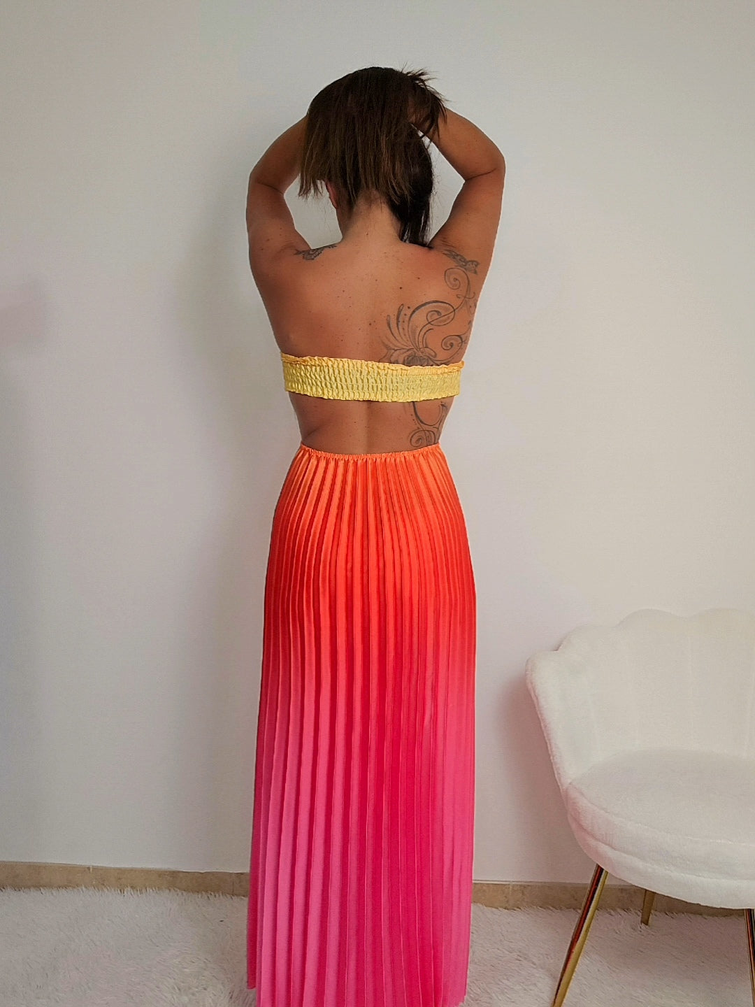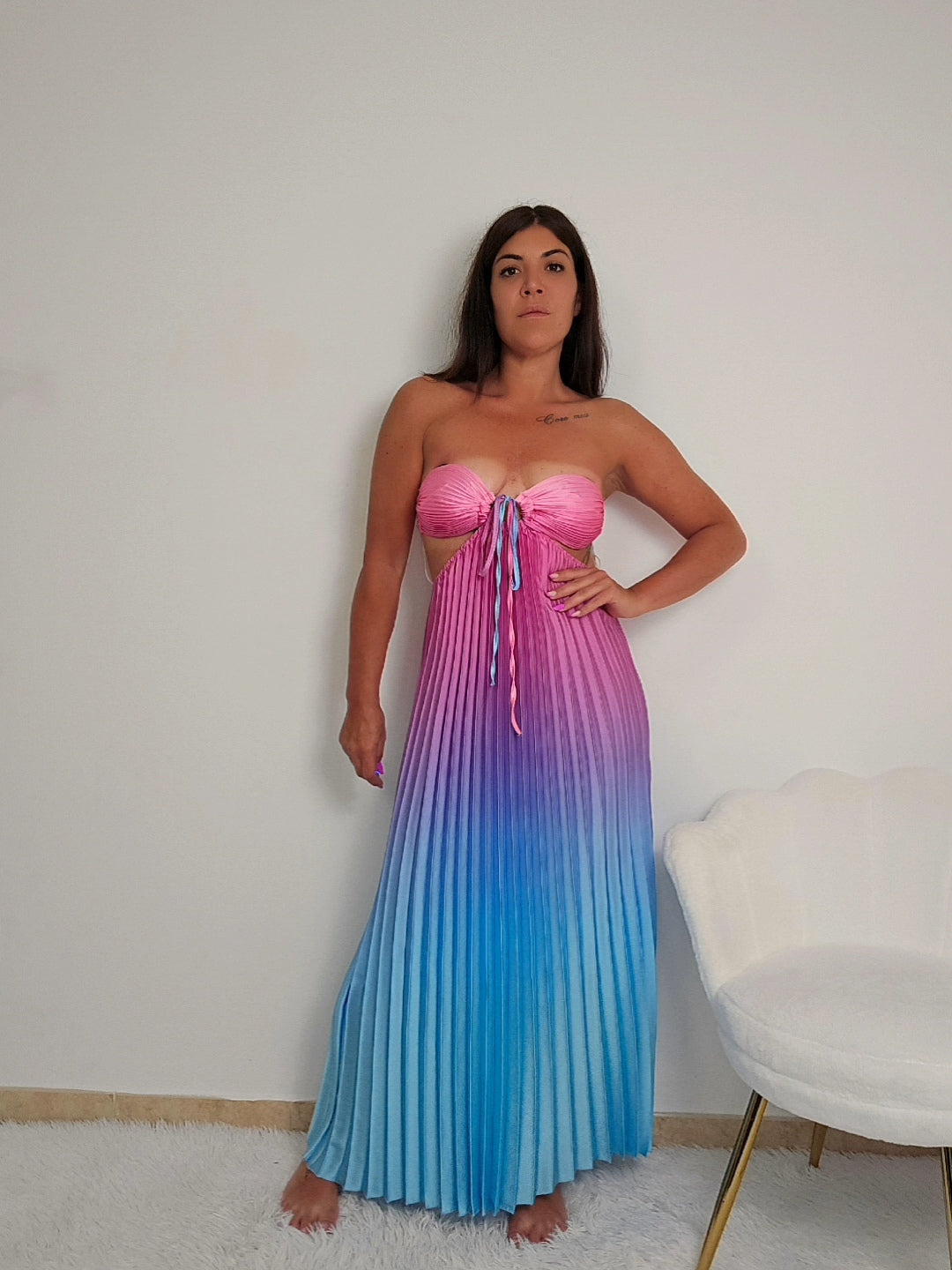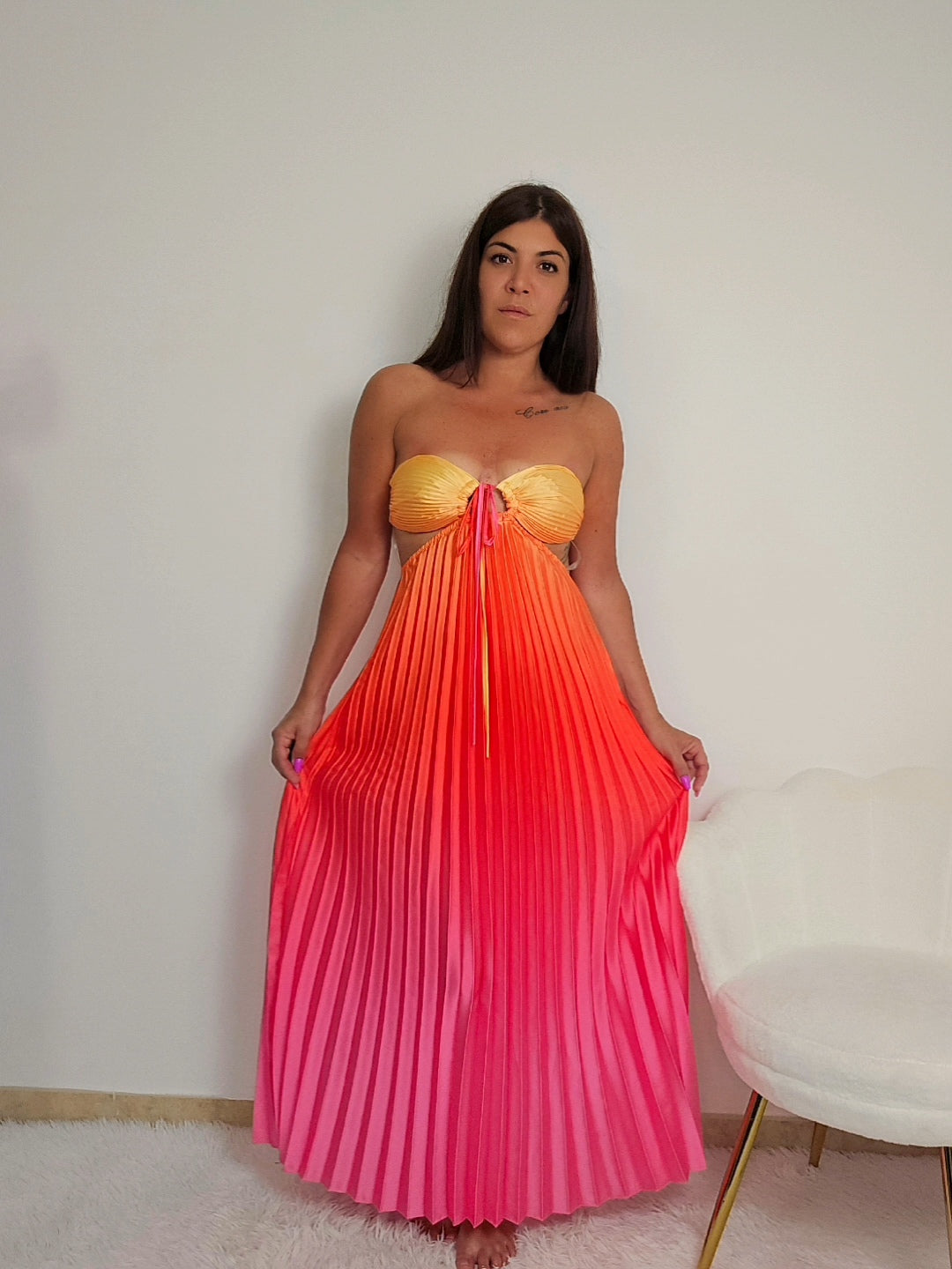 Il vestitino Mikonos unisce eleganza e vitalità estiva in un capo raffinato. Il corpetto senza spalline, delicatamente arricciato sul davanti, valorizza la silhouette con un equilibrio perfetto tra femminilità e modernità. La gonna, caratterizzata da sottili plissé, si muove con leggerezza ad ogni passo, creando un effetto fluido e dinamico ideale per le giornate più calde. Un abito pensato per chi cerca stile e comfort senza rinunciare a un tocco sofisticato.