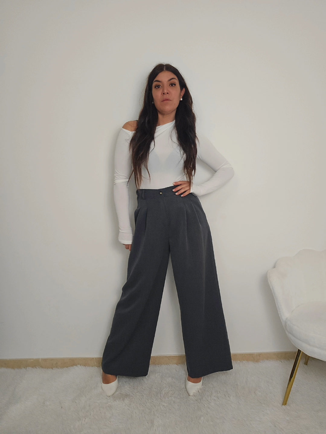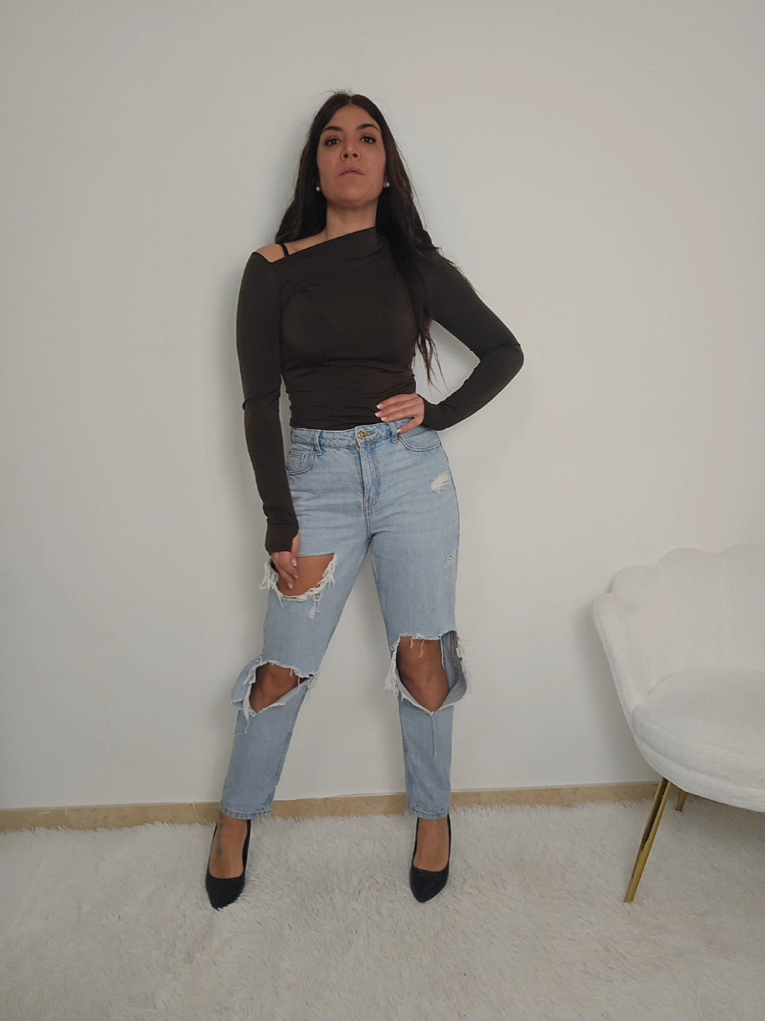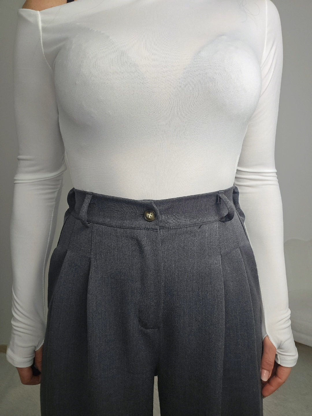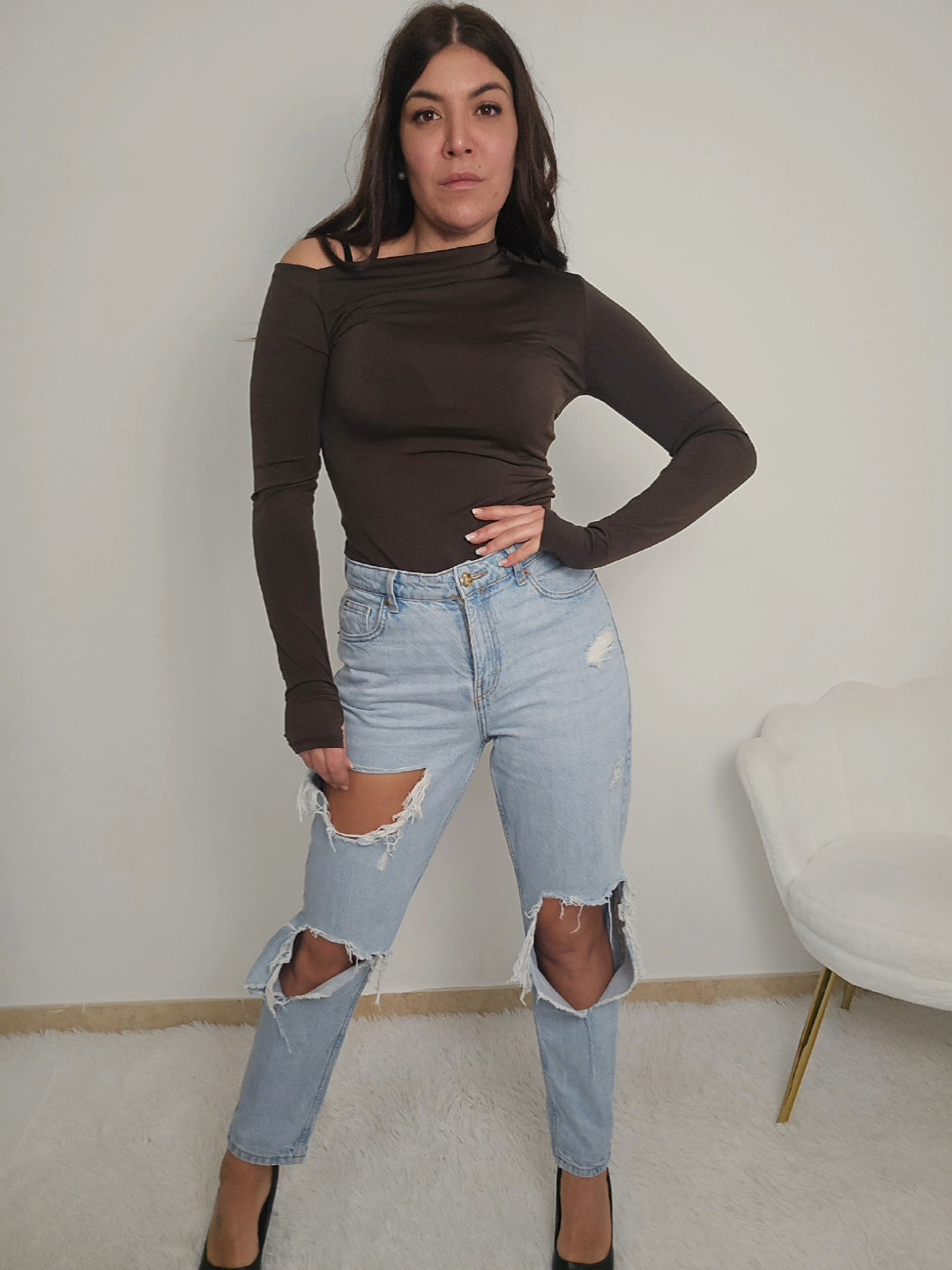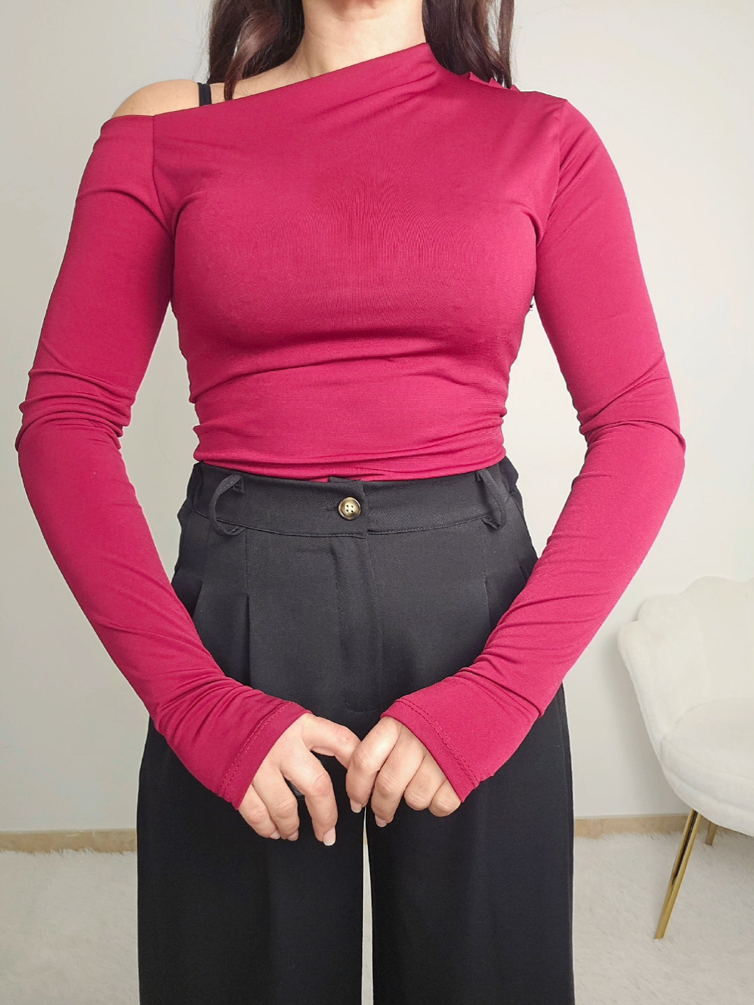 Body monospalla con scollatura asimettrica che espone elegantemente una spalla, creando un effetto sensuale e sofisticato. La silhouette aderente esalta le curve naturali del corpo, mentre le maniche lunghe dotate di occhiello per il pollice si trasformano in un raffinato mezzo guanto. Un capo versatile che combina audacia e classe, perfetto per chi desidera un look distintivo e contemporaneo.