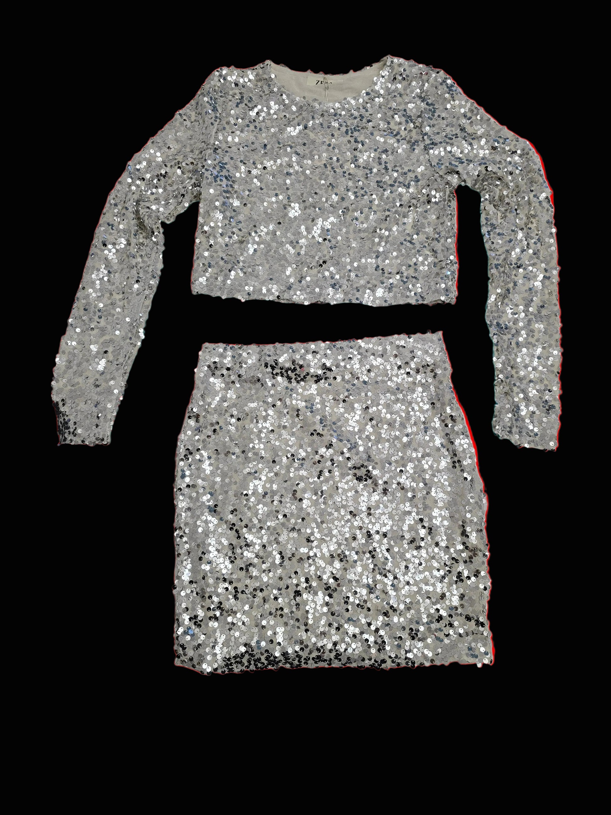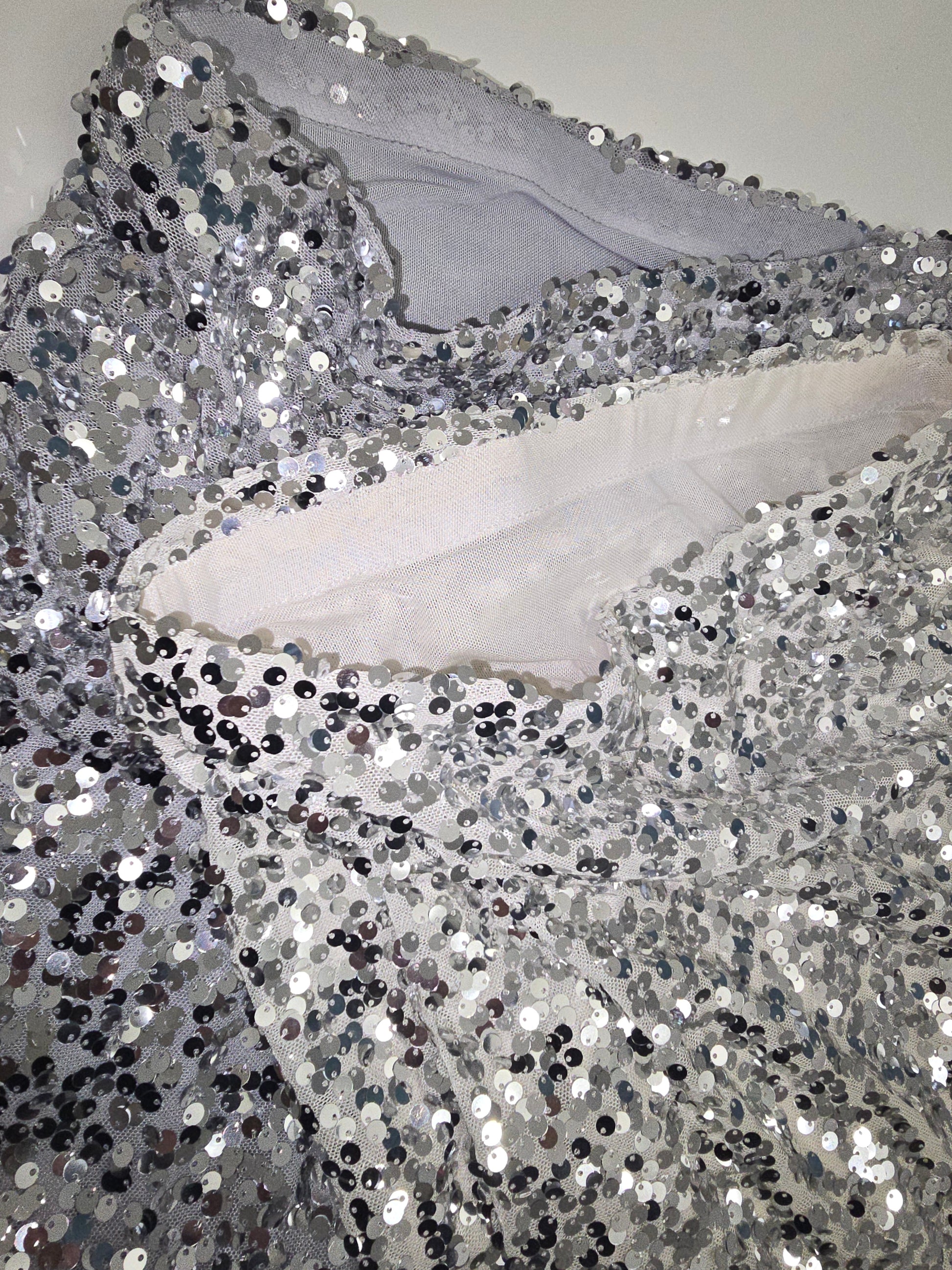 Coordinato con paillettes che trasforma ogni movimento in uno spettacolo di luce. Scegli tra la base bianca o argento per adattare il look al tuo stile personale. Questo set è concepito per chi vuole brillare senza compromessi: perfetto per sorprendere in discoteca, ideale per le festività di Capodanno e per occasioni dove l'eleganza scintillante fa la differenza. Un coordinato che garantisce visibilità e fascino in ogni contesto.