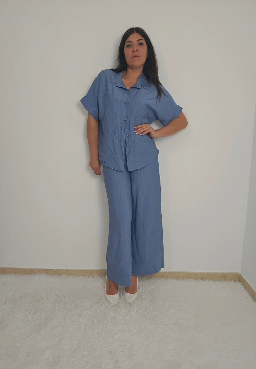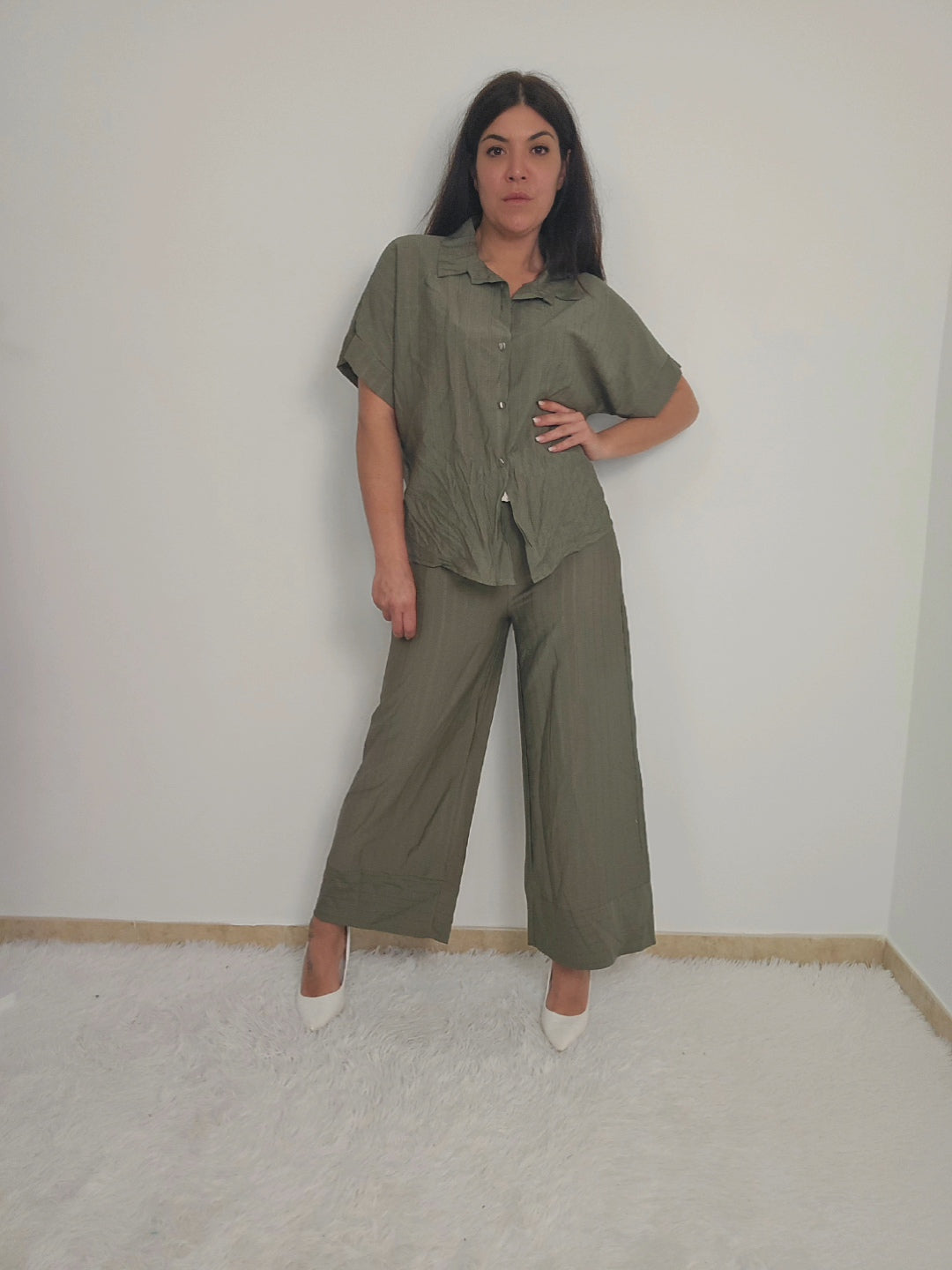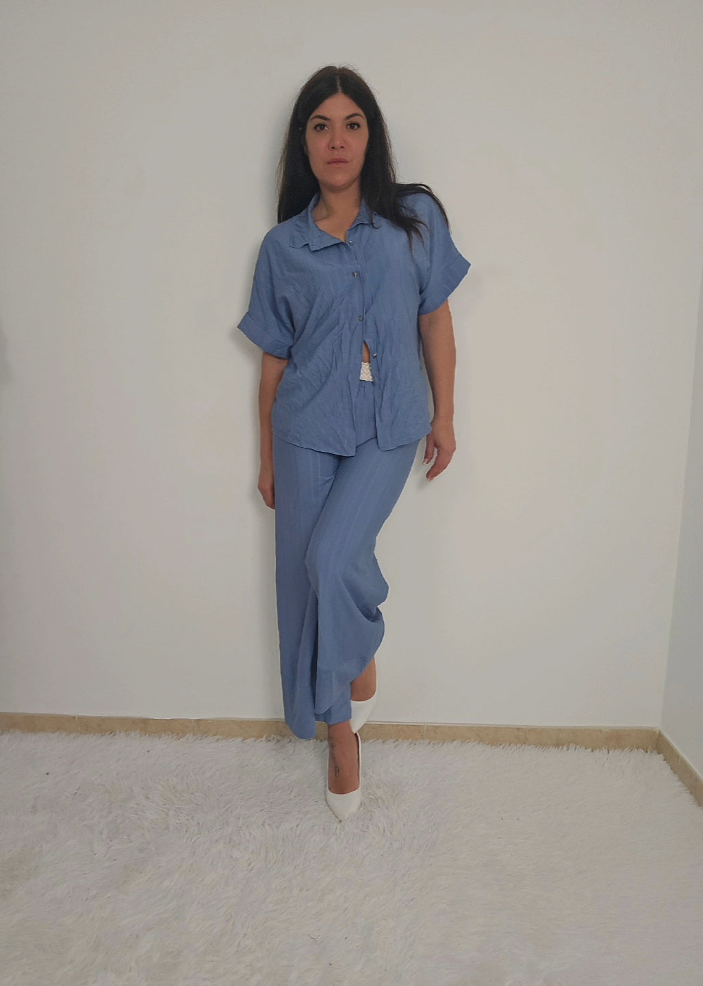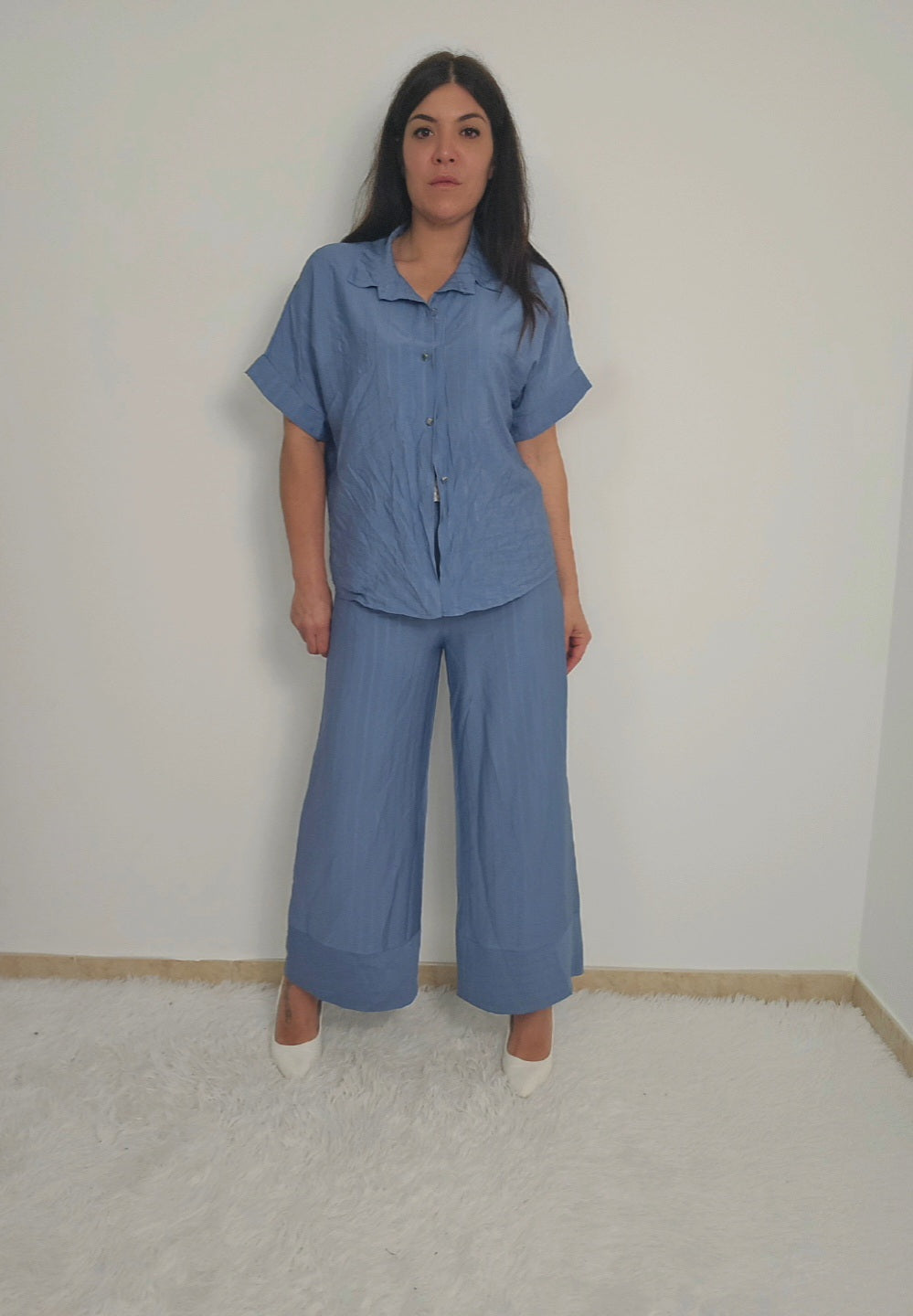Coordinato da donna con camicia a maniche corte e pantaloni a palazzo fino alla caviglia. Camicia con bottoni e possibilità di allacciare un fiocco in vita per delineare la figura o lasciare slacciata per un effetto over size. Tessuto fresco, morbido e elasticizzato adatto per ogni occasione.