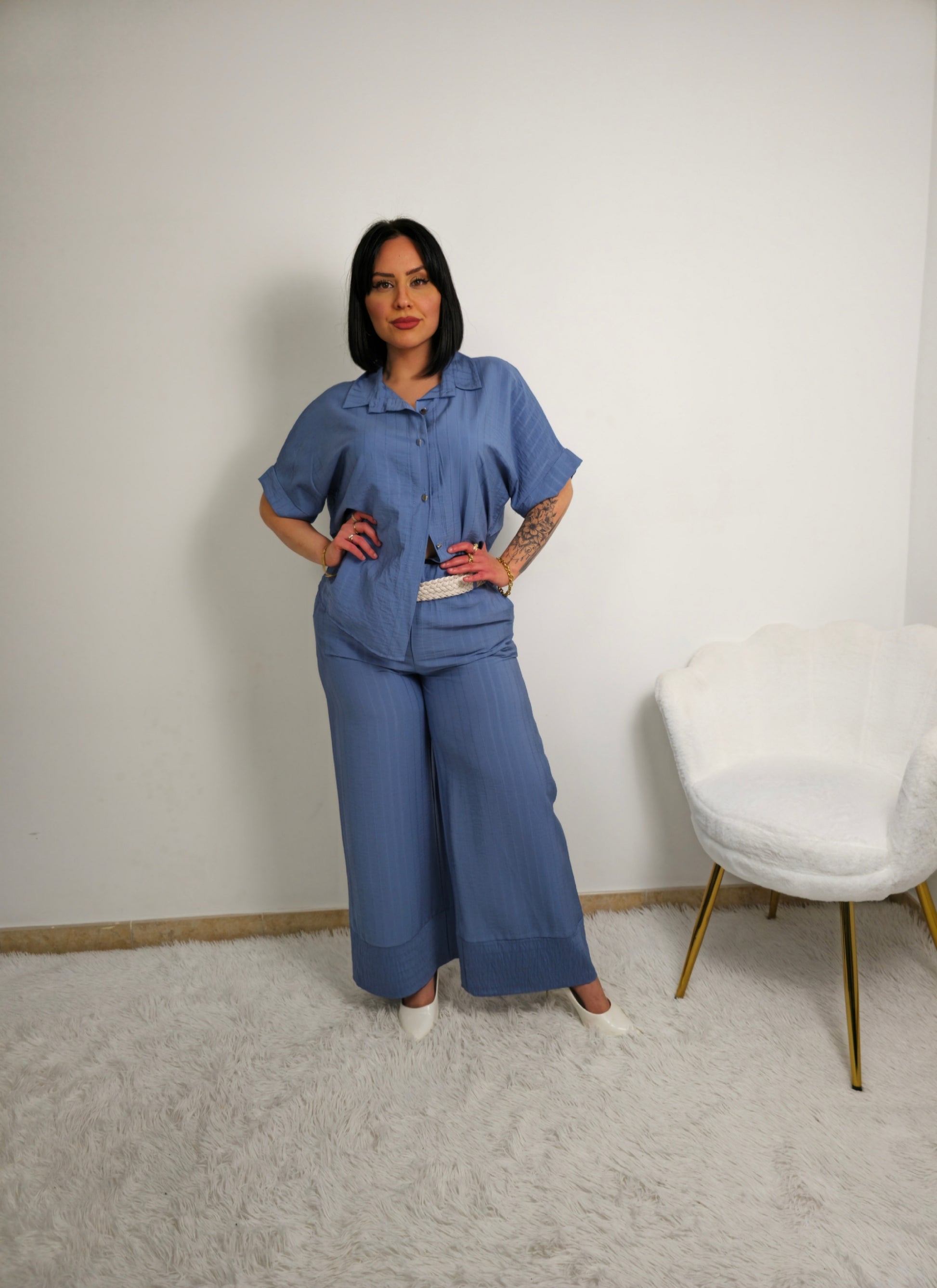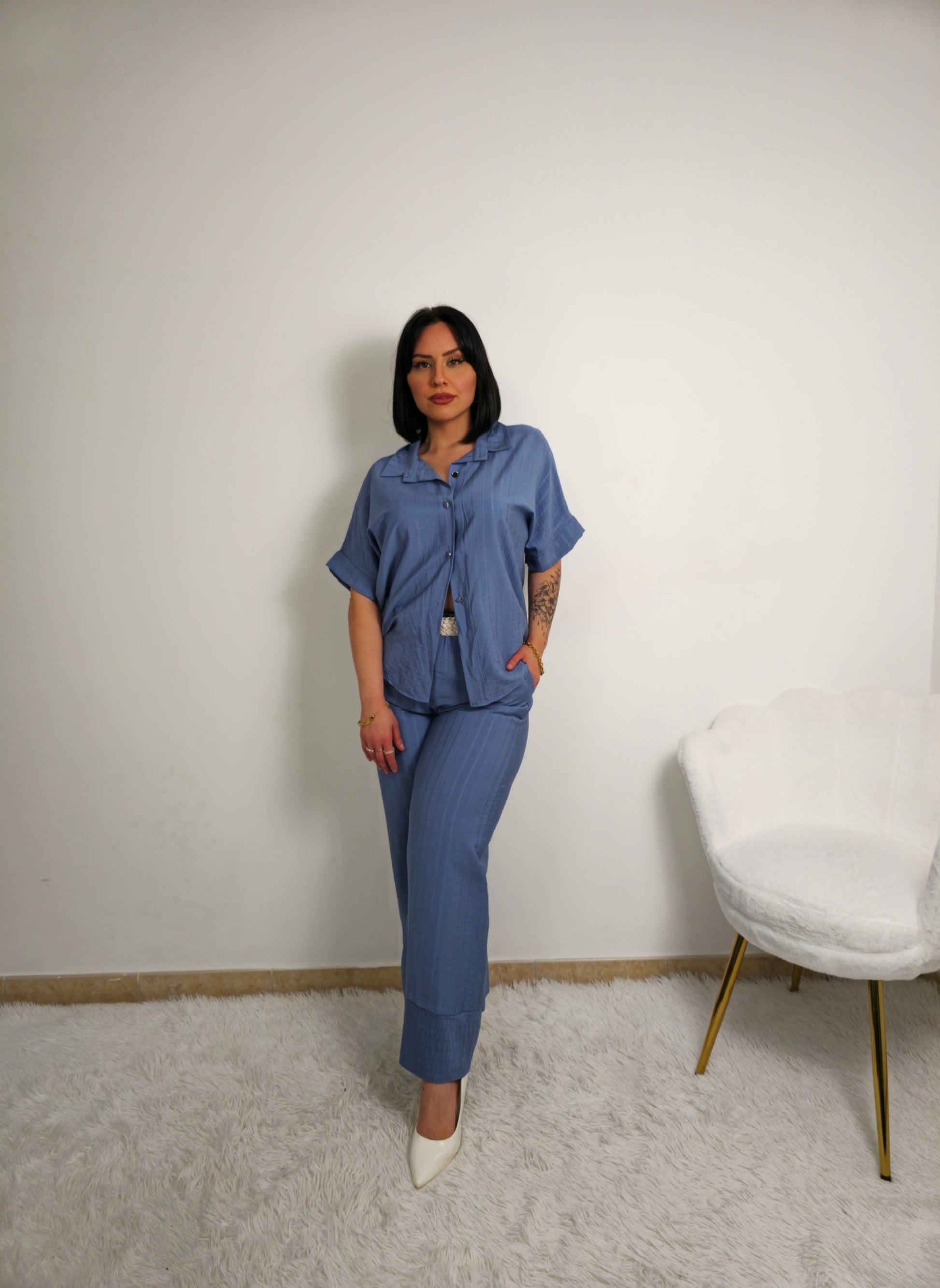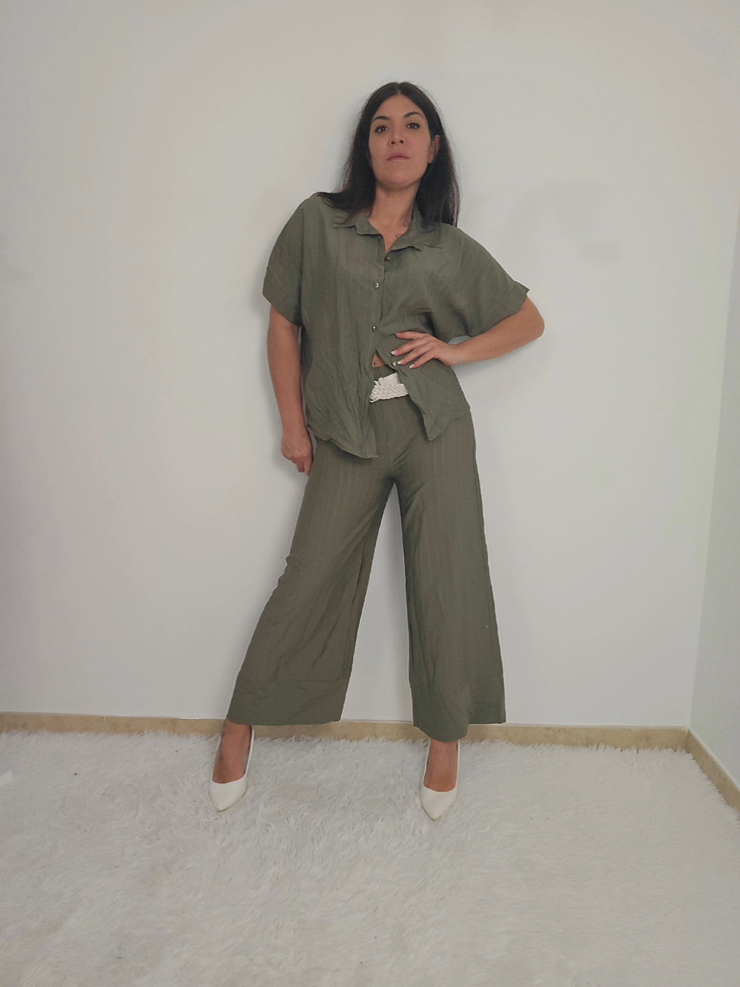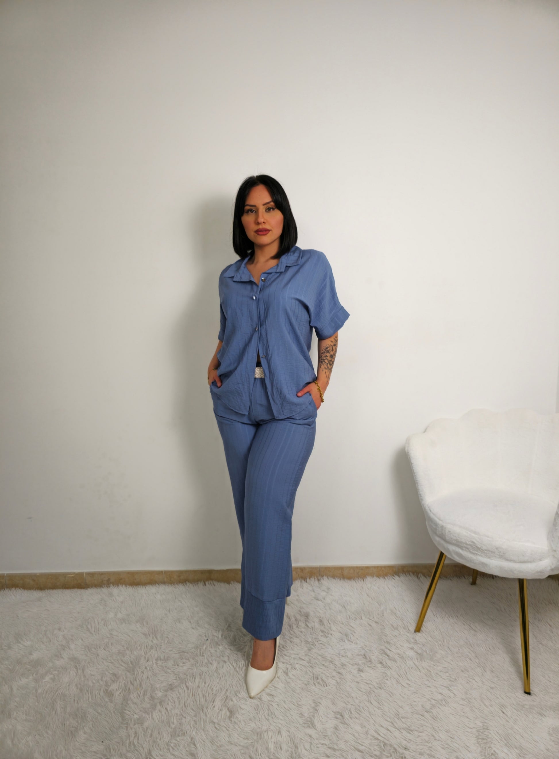 Coordinato da donna con camicia a maniche corte e pantaloni a palazzo fino alla caviglia. Camicia con bottoni e possibilità di allacciare un fiocco in vita per delineare la figura o lasciare slacciata per un effetto over size. Tessuto fresco, morbido e elasticizzato adatto per ogni occasione.