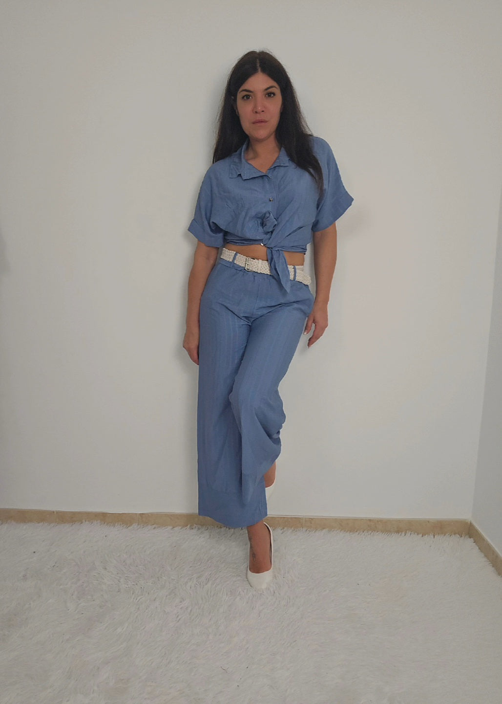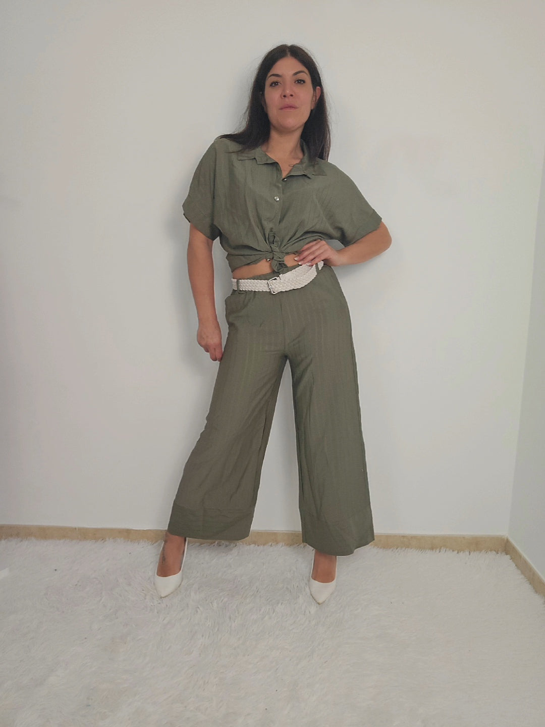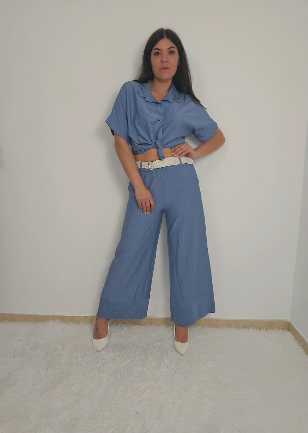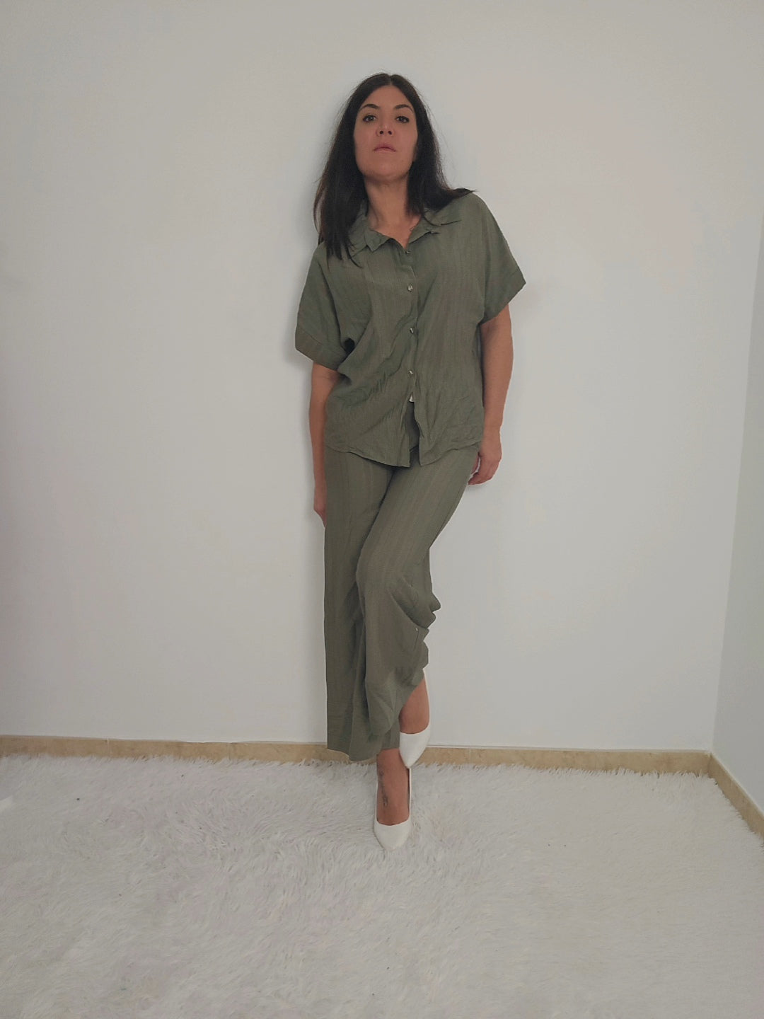 Coordinato da donna con camicia a maniche corte e pantaloni a palazzo fino alla caviglia. Camicia con bottoni e possibilità di allacciare un fiocco in vita per delineare la figura o lasciare slacciata per un effetto over size. Tessuto fresco, morbido e elasticizzato adatto per ogni occasione.