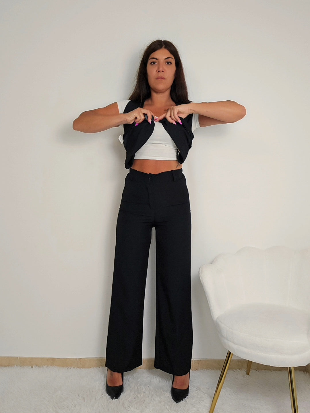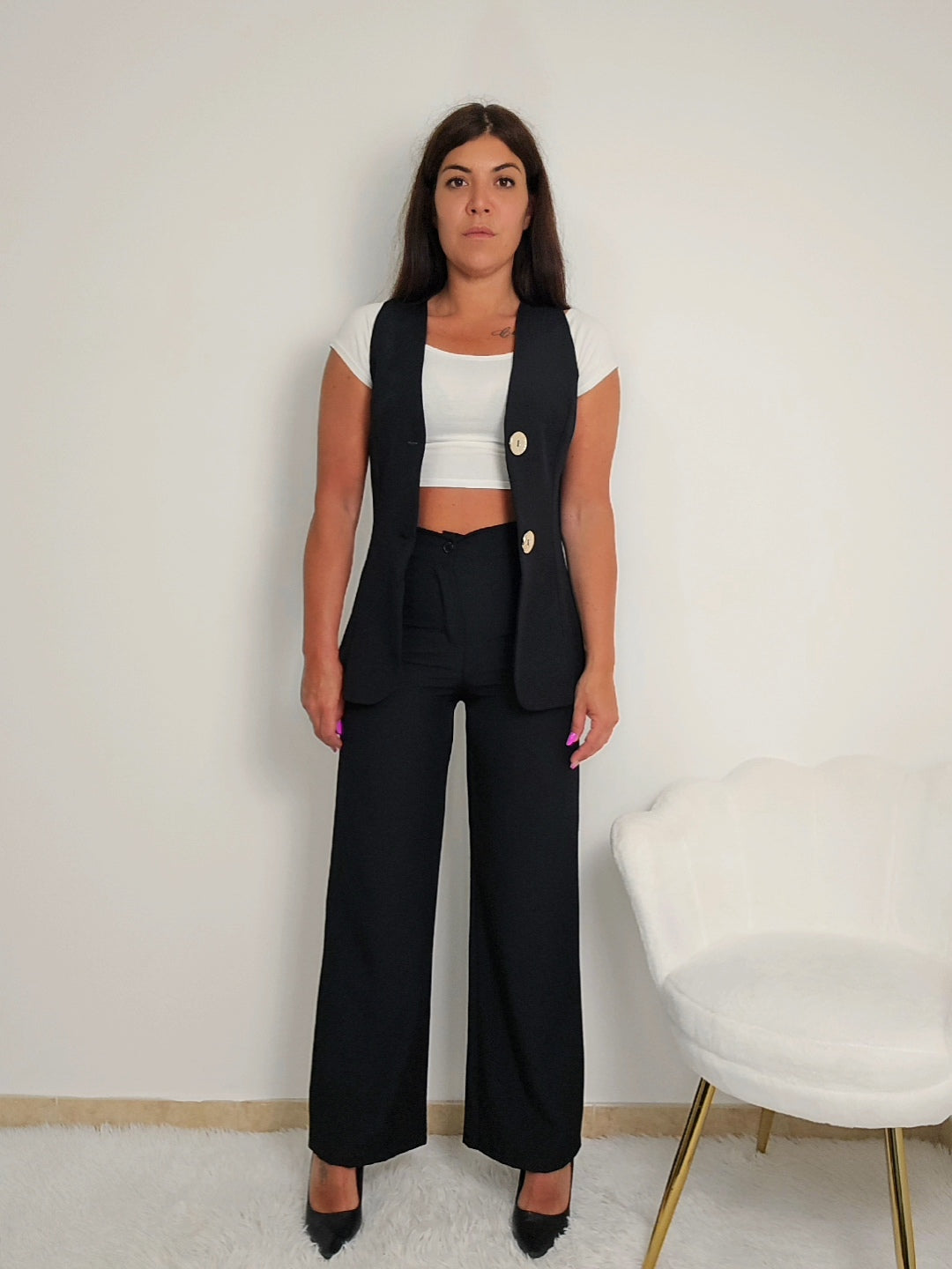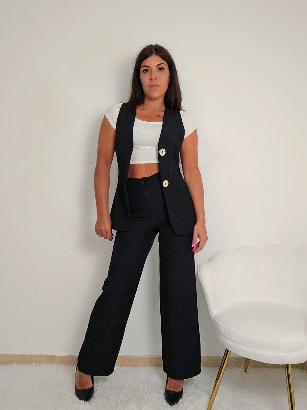 Questo coordinato composto da gilet e pantalone unisce eleganza e versatilità, perfetto per l’ufficio, un evento speciale o un aperitivo con amiche. Il gilet strutturato, dal taglio sartoriale, presenta un’abbottonatura frontale con due bottoni gioiello dorati che conferiscono un raffinato tocco di lusso. La mancanza di maniche lo rende ideale da indossare sopra top o camicie. Il pantalone a vita alta, con gamba larga e caduta fluida, assicura comfort e valorizza la silhouette con un effetto allungante. Adatto sia con tacchi che con scarpe da ginnastica, questo completo è una scelta sofisticata e pratica.