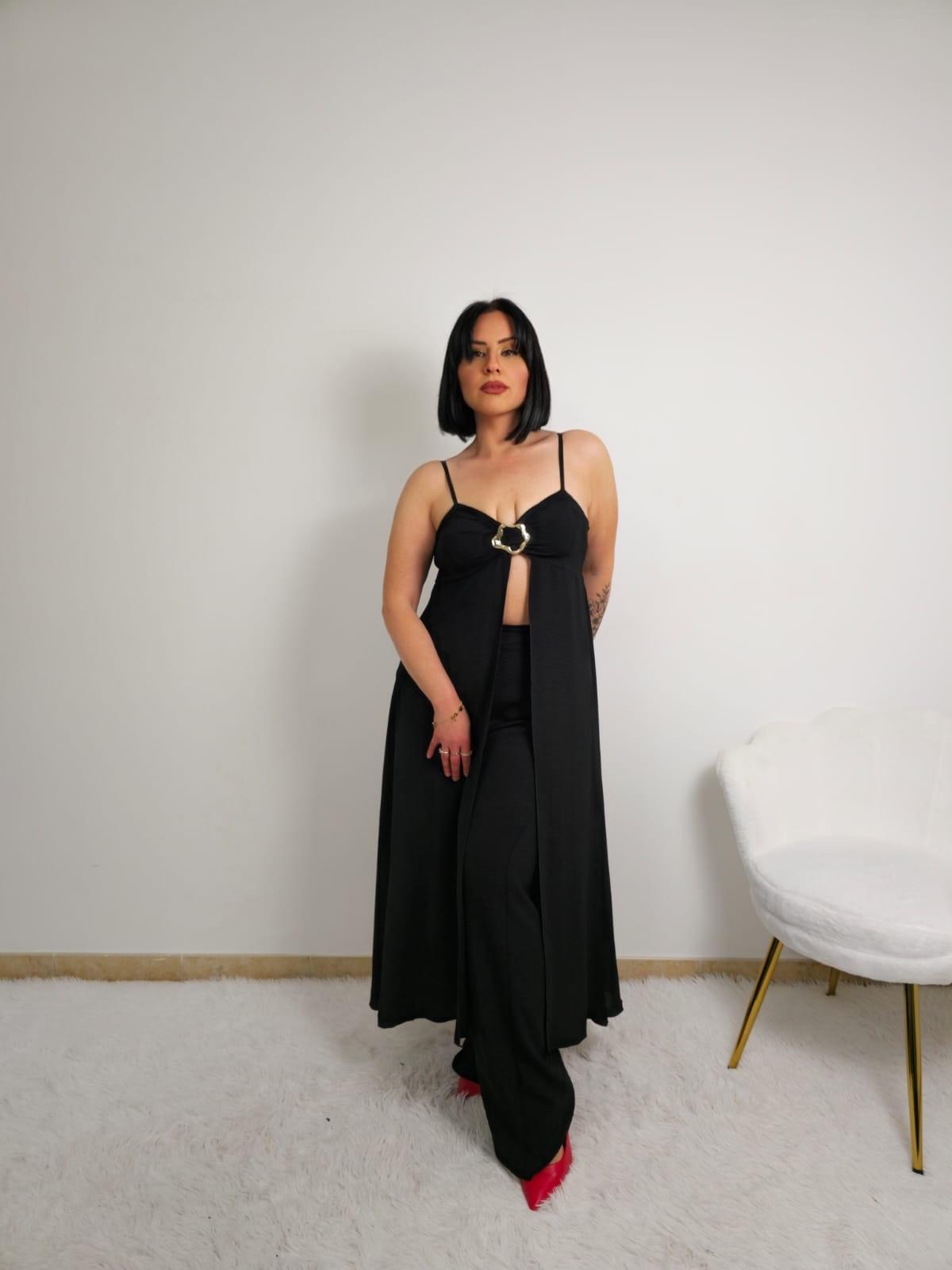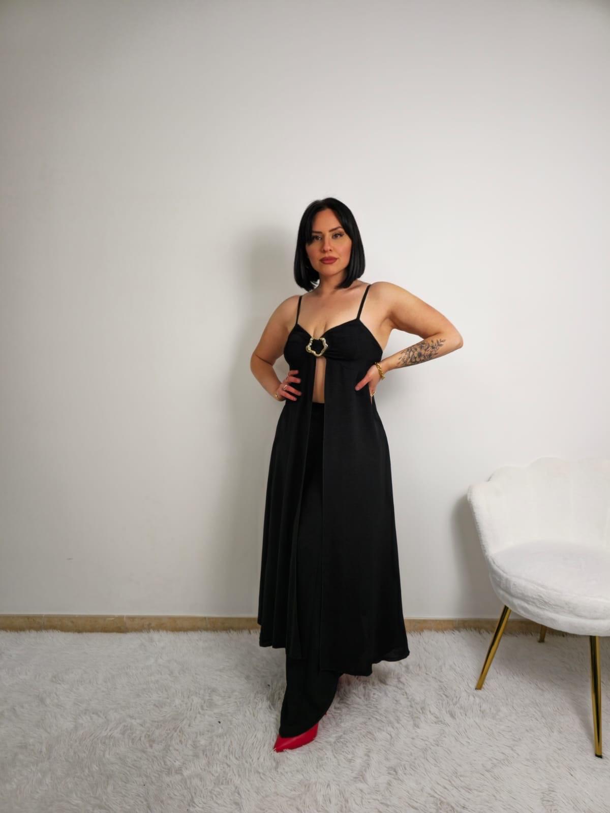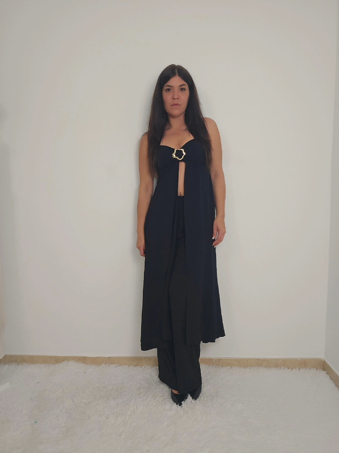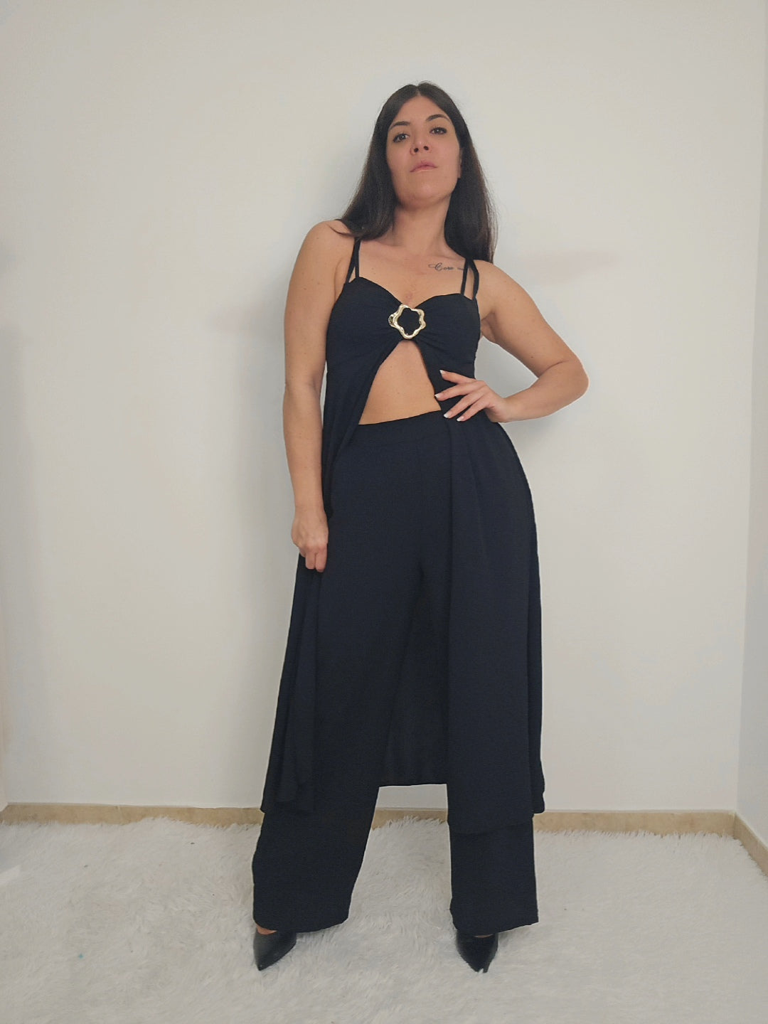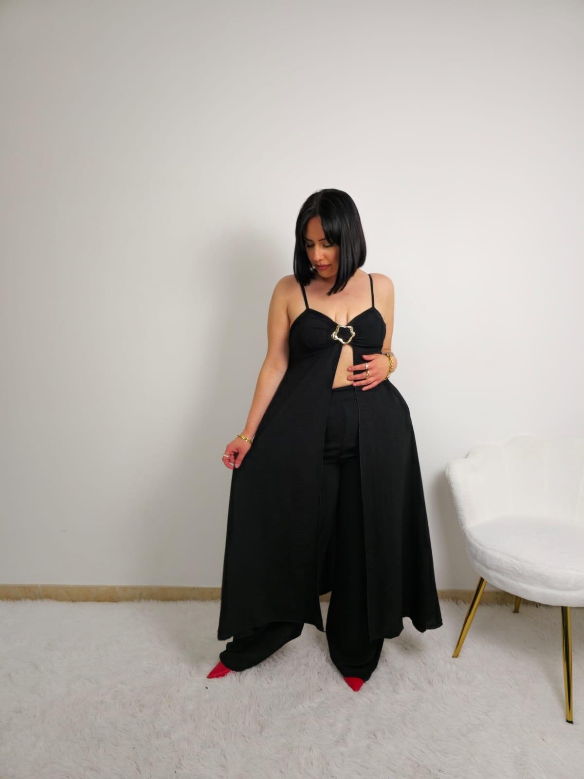 Coordinato composto da top asimettrico con spalline sottili, taglio cut-out frontale che valorizza il punto vita, e un dettaglio gioiello dorato che cattura subito l attenzione. L' apertura centrale dona un tocco sexy ma sofisticato. Il pantalone è a palazzo e a vita alta, ampio e fluido, perfettamente bilanciato per slanciare la figura e dare movimento all' intero look. Tessuto morbido, leggero e fresco.