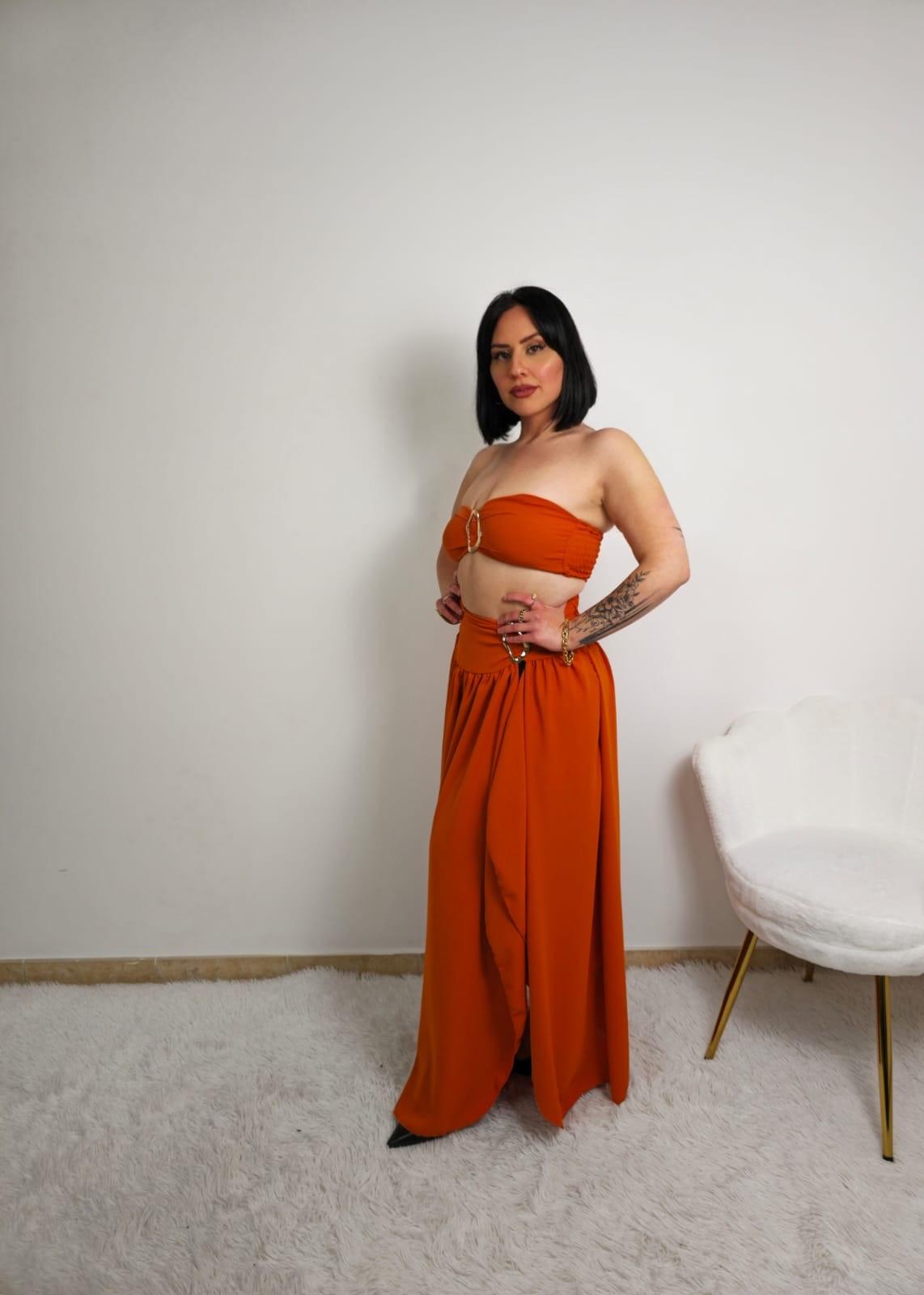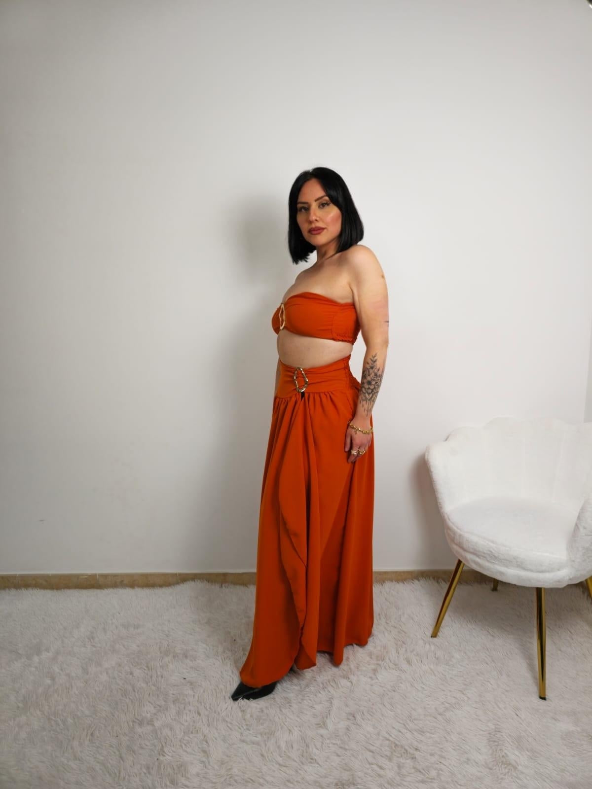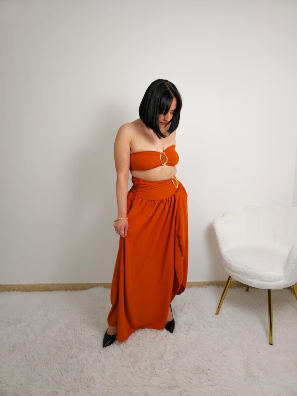 Questo coordinato composto da gonna e top è perfetto per chi cerca comfort e stile. Il top ha coppe incorporate con un dettaglio oro al centro, mentre la gonna si chiude a portafoglio e ha una fascia con lo stesso dettaglio oro laterale. Taglia unica per adattarsi alla perfezione.