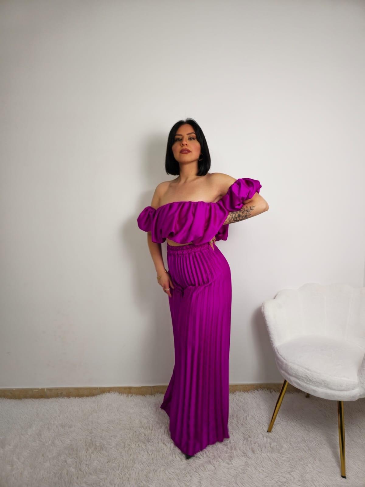 Questo coordinato plissettato comprende un top e un pantalone, entrambi con pieghe che donano movimento e un effetto femminile. Il top ha maniche attaccate lateralmente, mentre il pantalone è elasticizzato e a vita alta, garantendo comfort e uno stile elegante. Taglia unica.