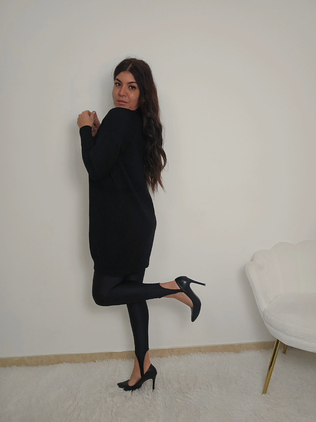 Leggings neri lucidi con staffa elastica sottopiede che mantiene il gambale perfettamente teso, eliminando fastidiose pieghe. Il design innovativo della staffa garantisce una vestibilità impeccabile durante tutto il giorno, rendendoli la scelta ideale da abbinare a décolletés o stivaletti. La finitura lucida conferisce un aspetto elegante e sofisticato, perfetto per look sia casual che più raffinati. Comfort e stile in un'unica soluzione.