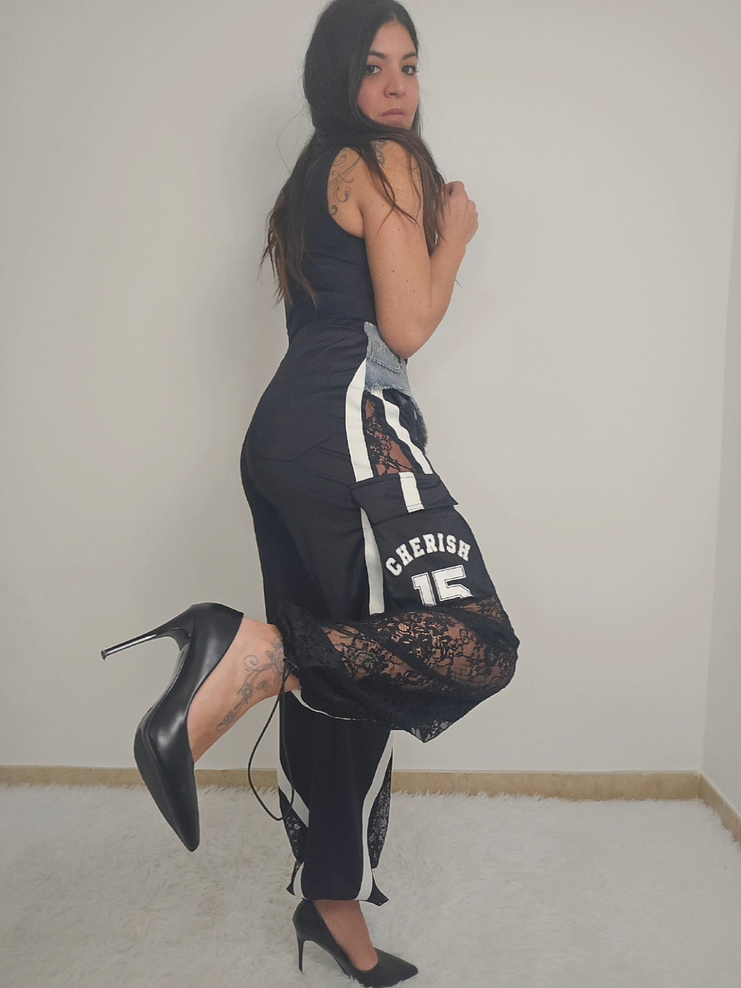 Esprimi la tua personalità con questi pantaloni unici che fondono stile urban e dettagli femminili. Presentano inserti laterali in pizzo semitrasparente che aggiungono un tocco elegante e sensuale. Perfetti per un look streetwear sofisticato o per un uscita serale dal carattere deciso, questi pantaloni sono pensati per chi ama distinguersi.