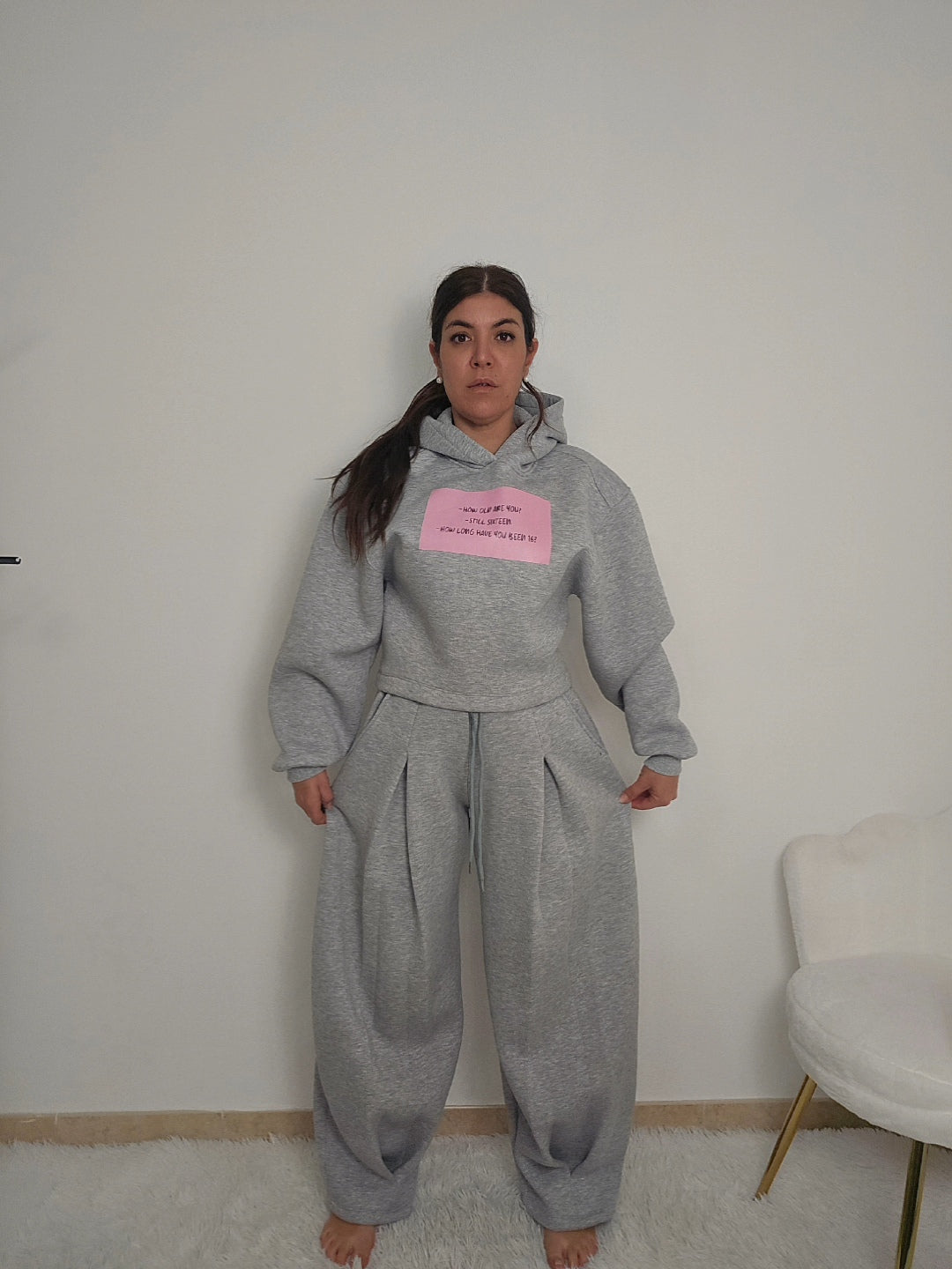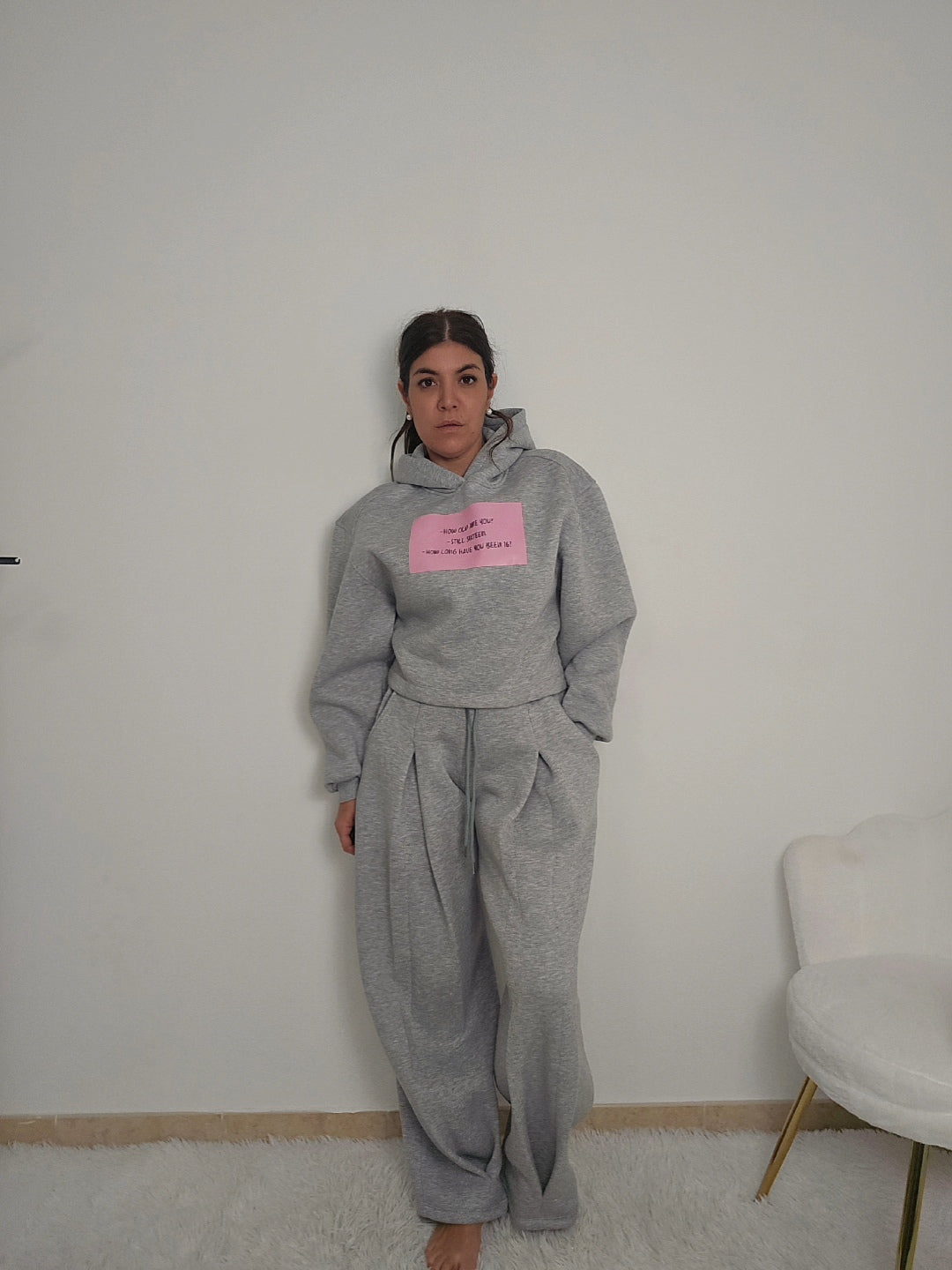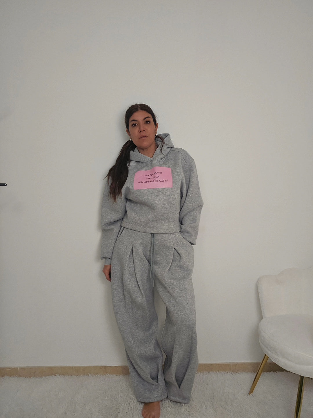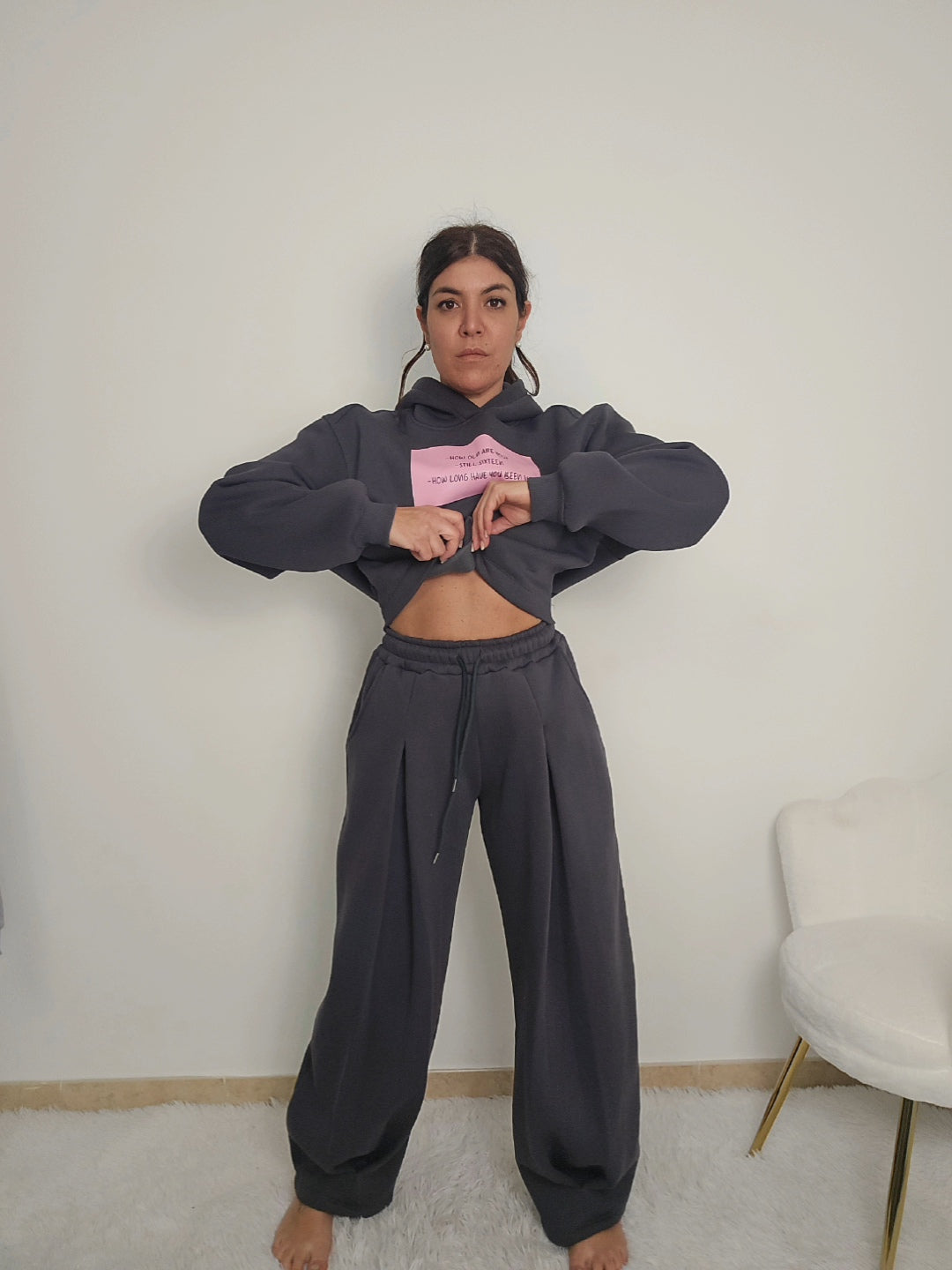 Tuta che combina comfort e stile contemporaneo. Il pantalone a gamba larga presenta pinces frontali che definiscono la silhouette, mentre la vita con coulisse si adatta perfettamente a ogni corpo. La felpa dal taglio rilassato e il cappuccio completano un look versatile, ideale per chi ricerca praticità senza compromessi estetici. Perfetta per il tempo libero e le occasioni casual. Felpata all interno.