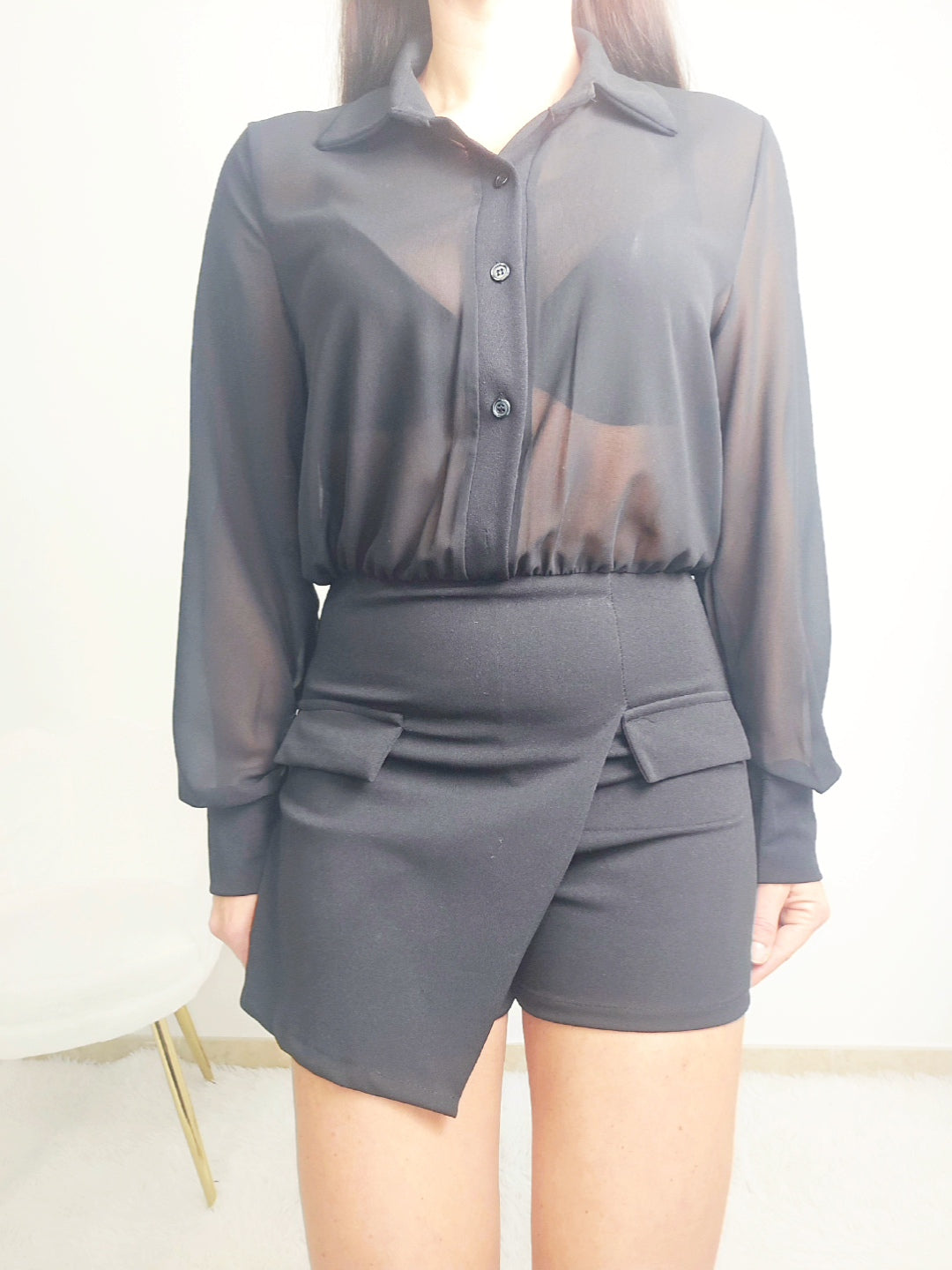 Tutina fashion in tessuto elasticizzato che combina praticità e stile contemporaneo. La parte inferiore presenta un pratico pantaloncino-gonna, mentre la parte superiore è caratterizzata da una camicetta trasparente che crea un effetto sofisticato e versatile. La composizione elasticizzata garantisce comfort e libertà di movimento, adattandosi perfettamente al corpo. Un capo ideale per chi ricerca un equilibrio tra eleganza e funzionalità, perfetto per occasioni casual o semi-formali.